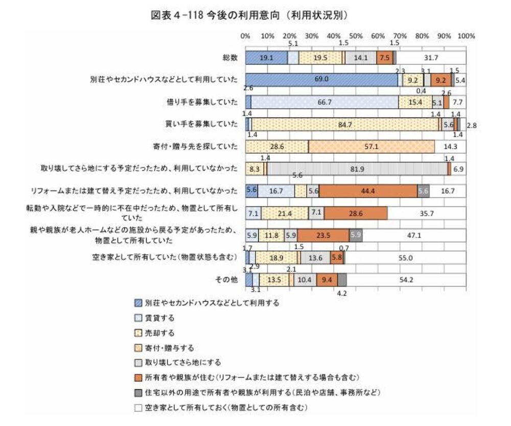 後は、セカンドハウスとして利用2割、賃貸として貸すが約15%、建替えやリフォームとして活用するが8%等の割合です。